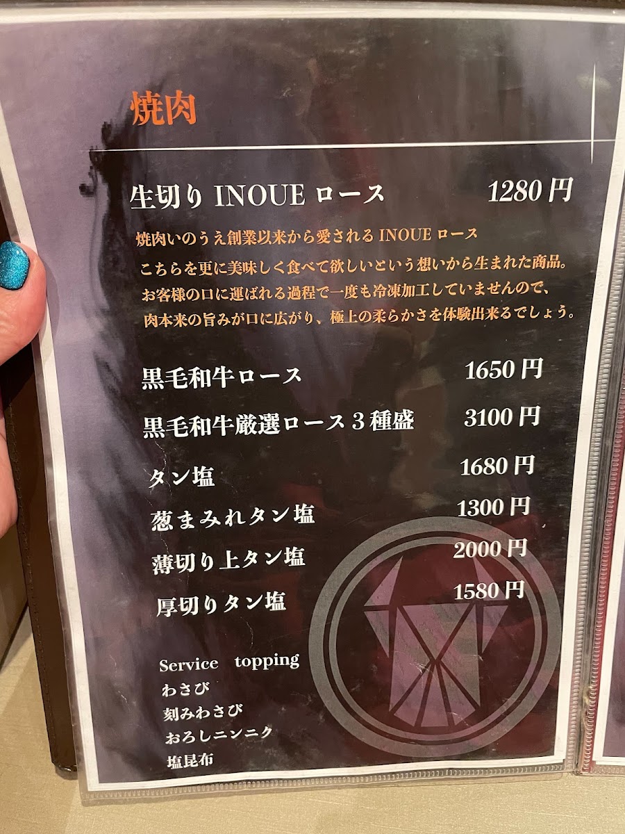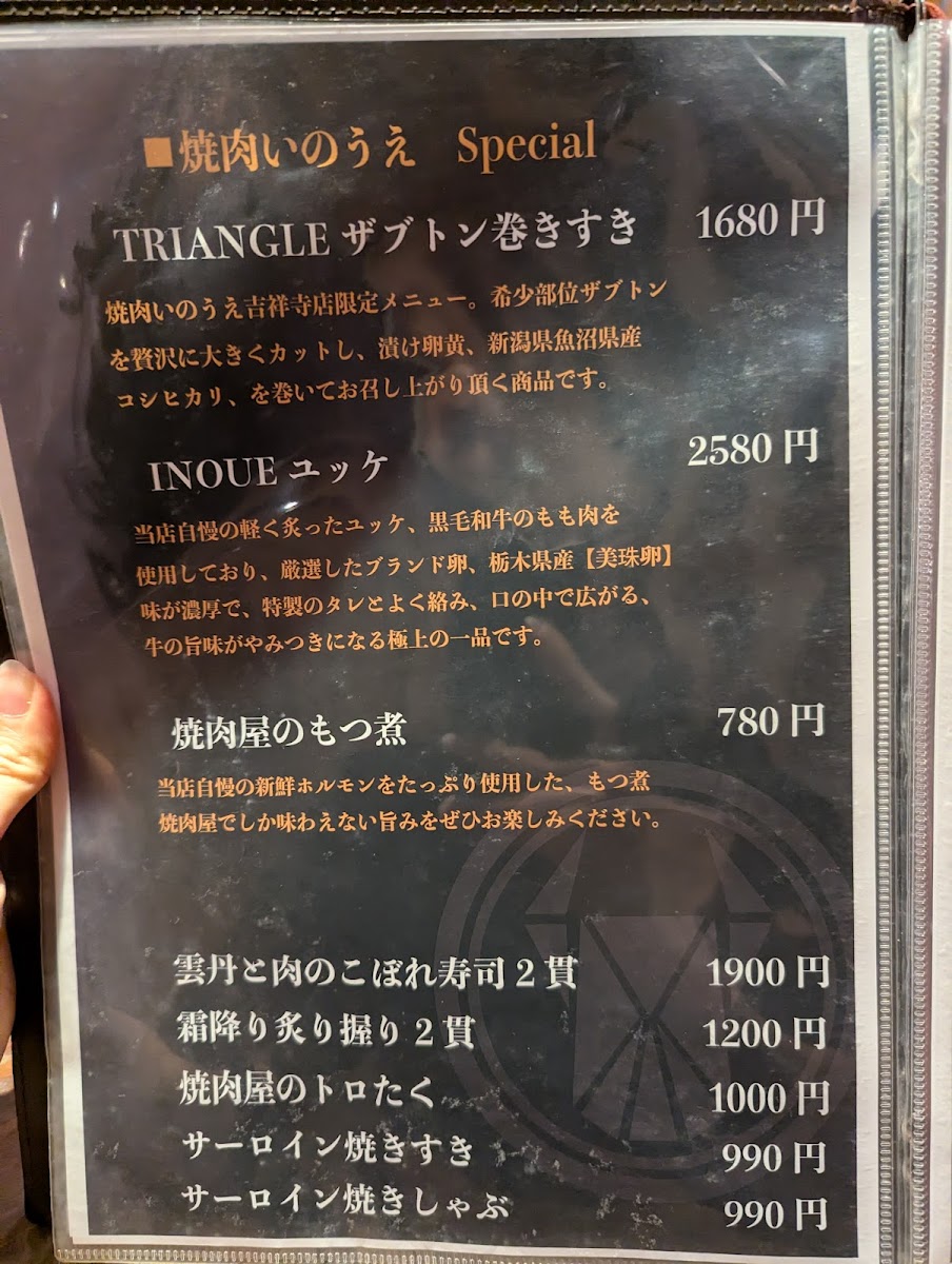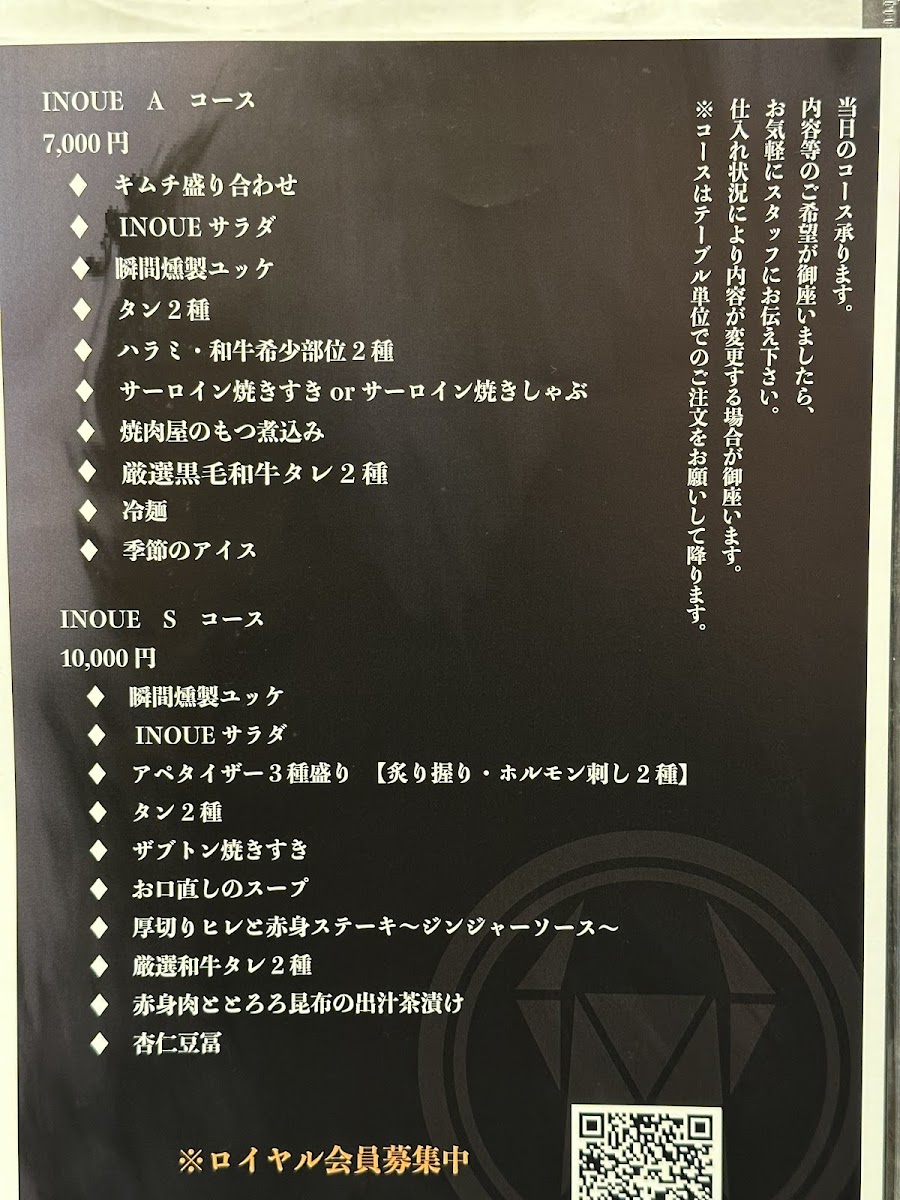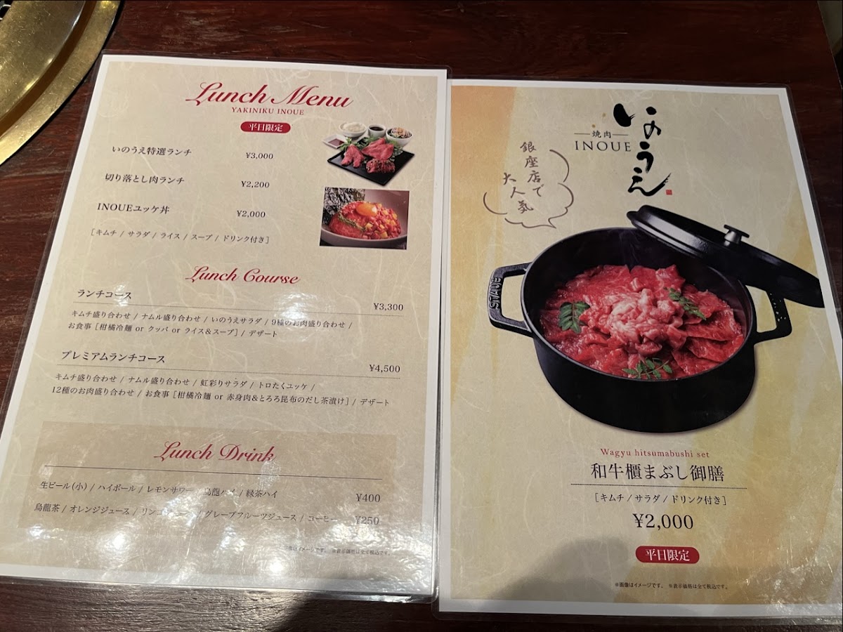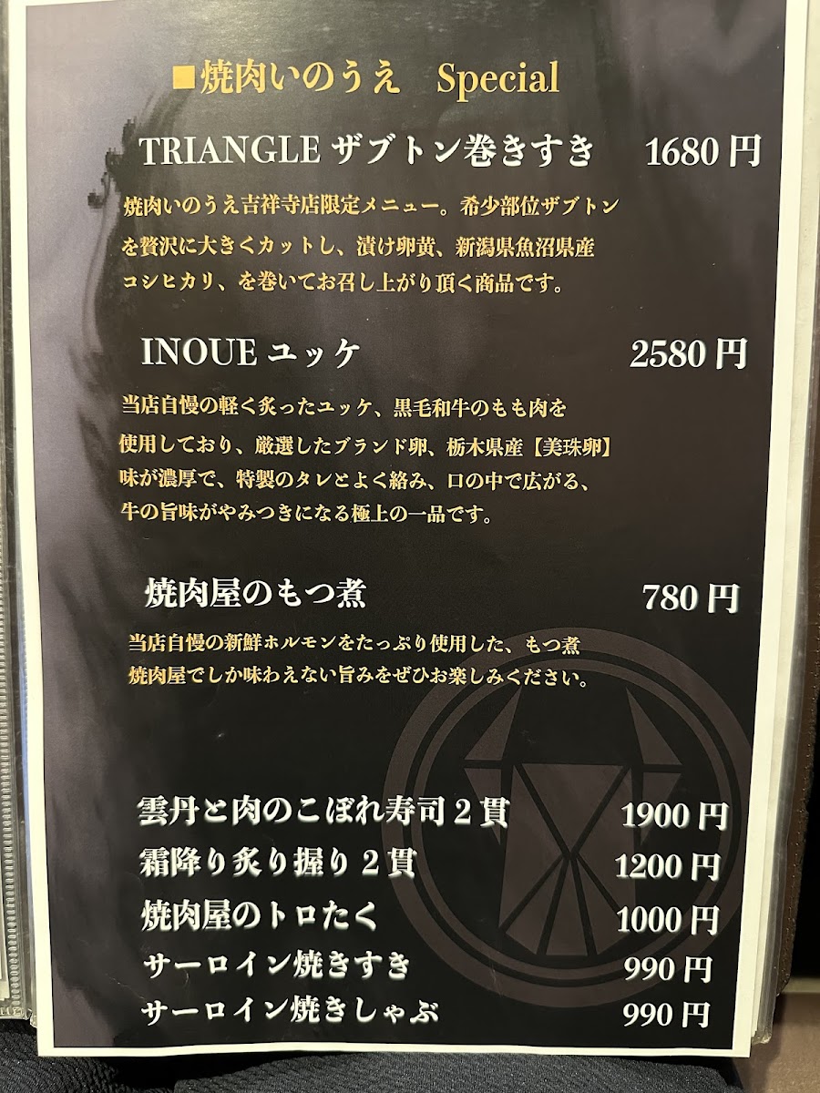 Yakiniku Inoue Kichijōji offers a diverse and enticing menu perfect for any occasion, especially for gatherings like忘年会 (year-end parties) or女子会 (girls' night out). The restaurant's 9種類の食べ比べ焼肉ランチコース (9-Variety Yakiniku Lunch Course) is a highlight, featuring 14品 (14 items) designed for a rich tasting experience. The course includes a selection of premium meats, such as the 黒毛和牛タン3種盛り (3 kinds of Black Wagyu Beef Tongue), and the restaurant’s signature 生切りいのうえロース (Inoue's Freshly Cut Sirloin). For those who prefer a lighter option, the soup can be substituted for クッパ (Korean rice soup) for an additional +100円. Drinks are also available, including a variety of ハイボール (Highballs) starting at 650円. With its variety of meats, sides, and drinks, the menu offers something for everyone, making it a great spot for a fulfilling and enjoyable dining experience in Kichijōji.
